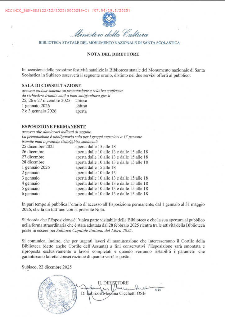 Per i gruppi si richiede comunque la prenotazione per motivi organizzativi all’indirizzo di posta elettronica: prenota.visita@biss-subiaco.it